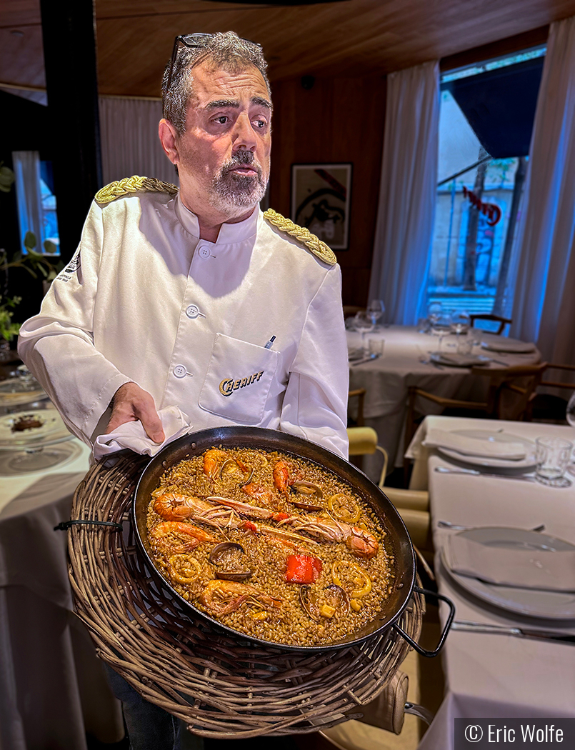 A waiter in a Barcelona paella restaurant proudly exhibits his kitchen's work to a guest.
