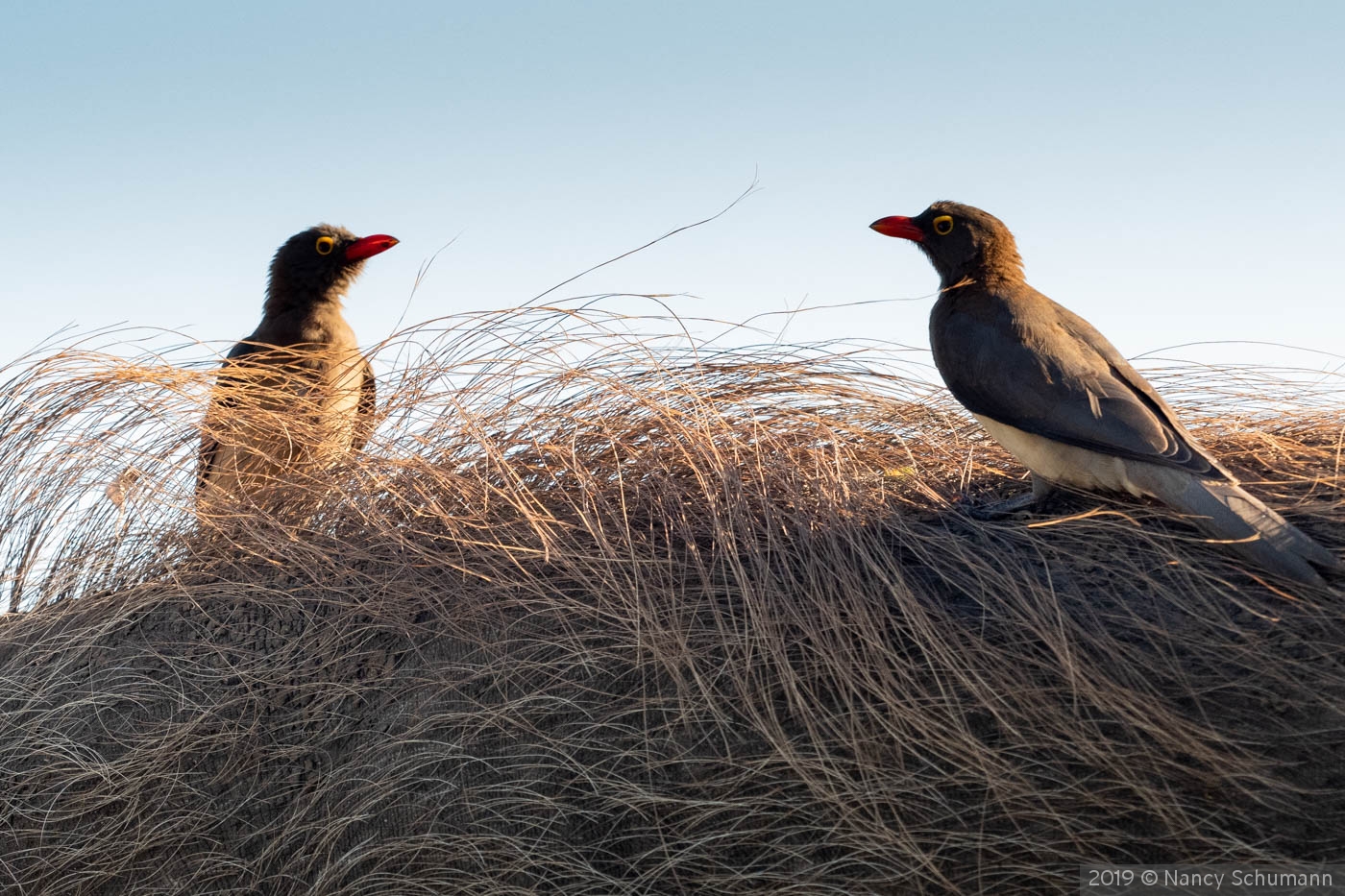 This was taken at the Zimanga Private Game Reserve in South Africa. They perch on large mammals and eat ticks, small insects, botfly larvae and other parasites. The behavior of oxpeckers towards large mammals was previously thought to be an example of mutualism, though recent research suggests the relationship is parasitic in nature.