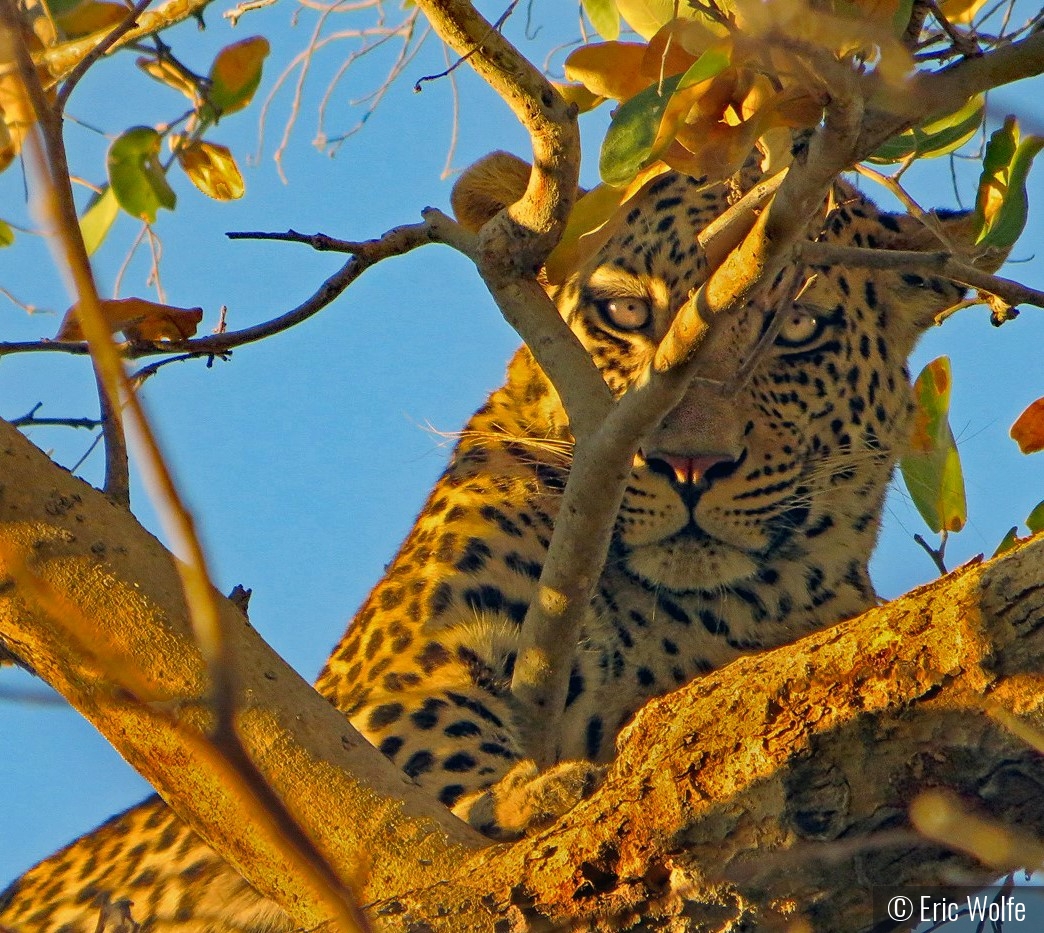 Our Botswana guides followed hyena tracks to the base of a large tree. Looking up we saw the hanging carcass of an unfortunate animal. Only then did we realize we were being watched by this beautiful leopard.