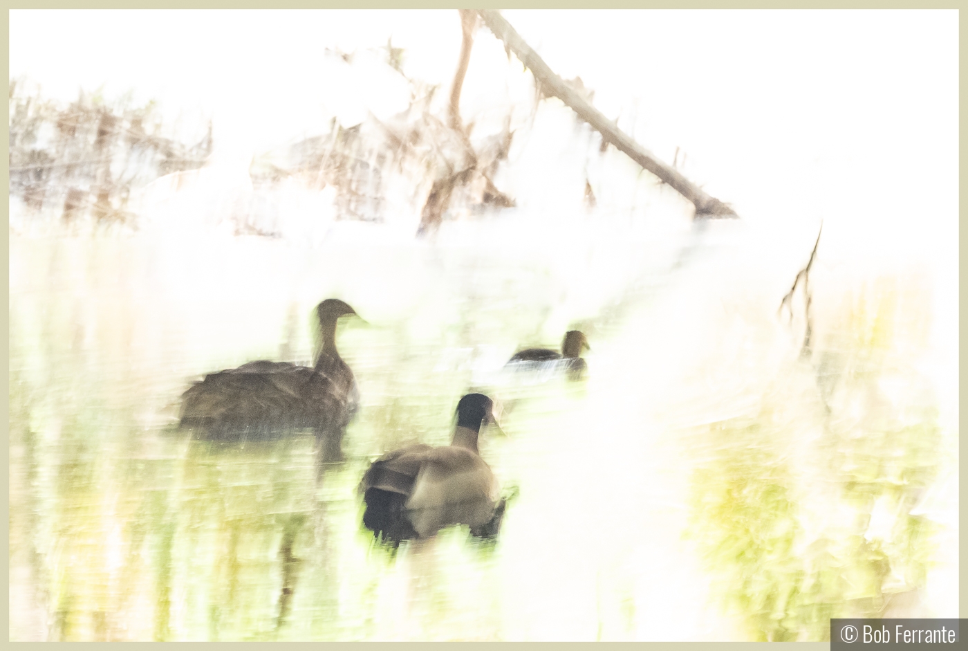 A family of mallards traverse a quiet section of stream in Elizabeth Park, Hartford, Ct. Intentional camera movement and soft focus were used to help create the mood of this image. I chose to use a high key view to give the scene a lighter and more serene feel. The ducks swim in harmony toward white negative space to imply they have "no particular place to go".